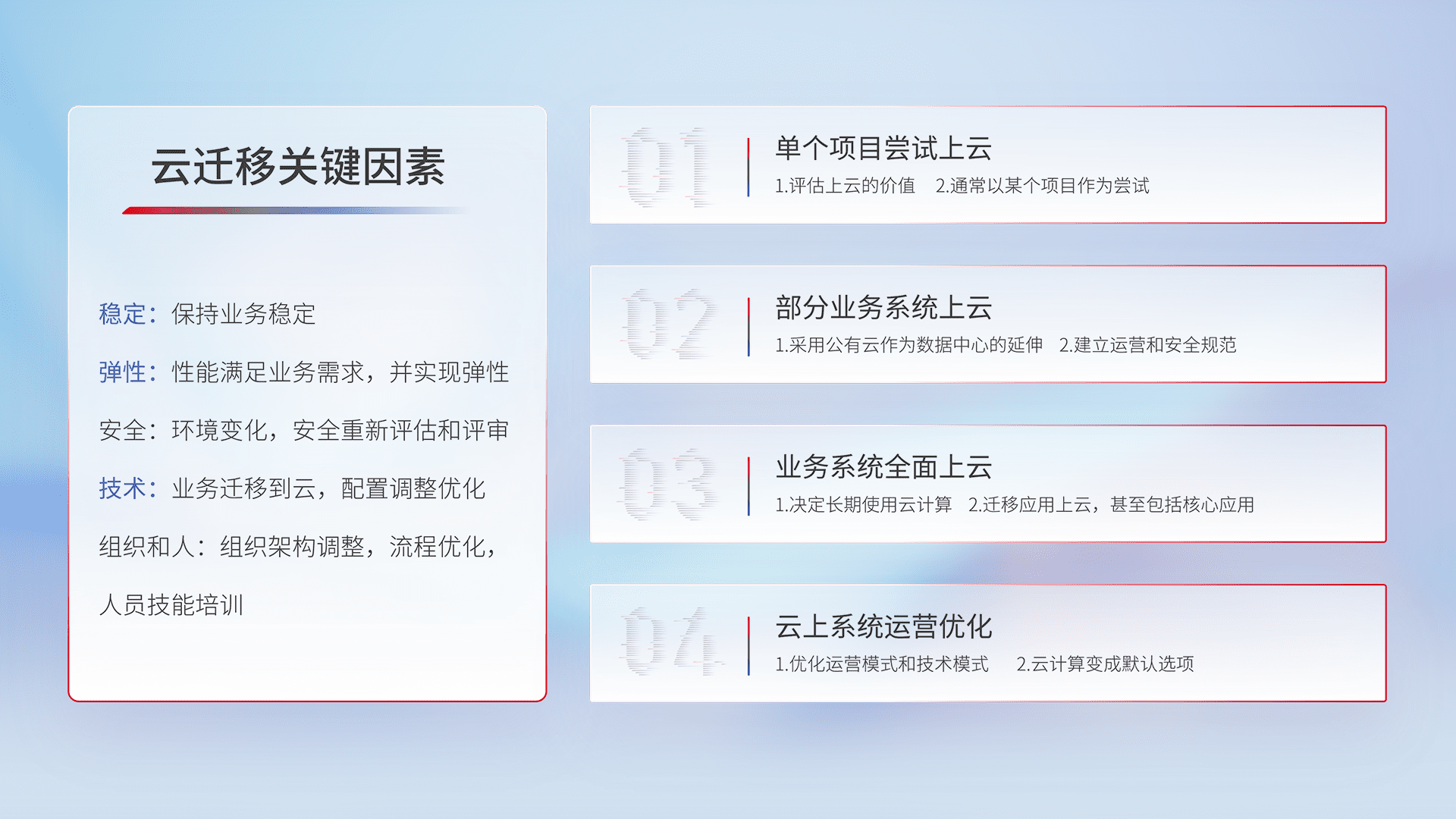 结合实际业务,,,,从规划设计、、、、云平台选型、、、、云原生改造、、数据迁移、、、、集成交付,,,,迁移全过程为客户识别最佳上云路径,,,,做好风险识别管理,,,设计网络架构、、、、身份权限、、安全审计合规、、、、操作审计、、、、日志审计、、、监控告警策略、、多站点容灾设计等,,,,对云上基础设施进行整体规划,,提升IT治理水平,,,以满足弹性、、、高可用、、、高性能的需求。。