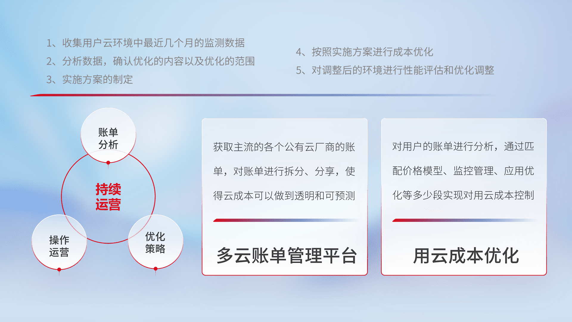 通过多云纳管,,,,以统一的资源数据模型把客户的云资源进行抽象和封装,,,进而实现对多云资源的统一操作,,,保障云资源管理的可靠性、、、稳定性与可用性。。量身定制化运维内容,,,,配置、、开发运维、、补丁管理、、、备份、、监控、、、认证和访问管理、、审计和日常巡检等,,,保障在用云过程中的可靠度,,,,稳定度以及高可用率。。。